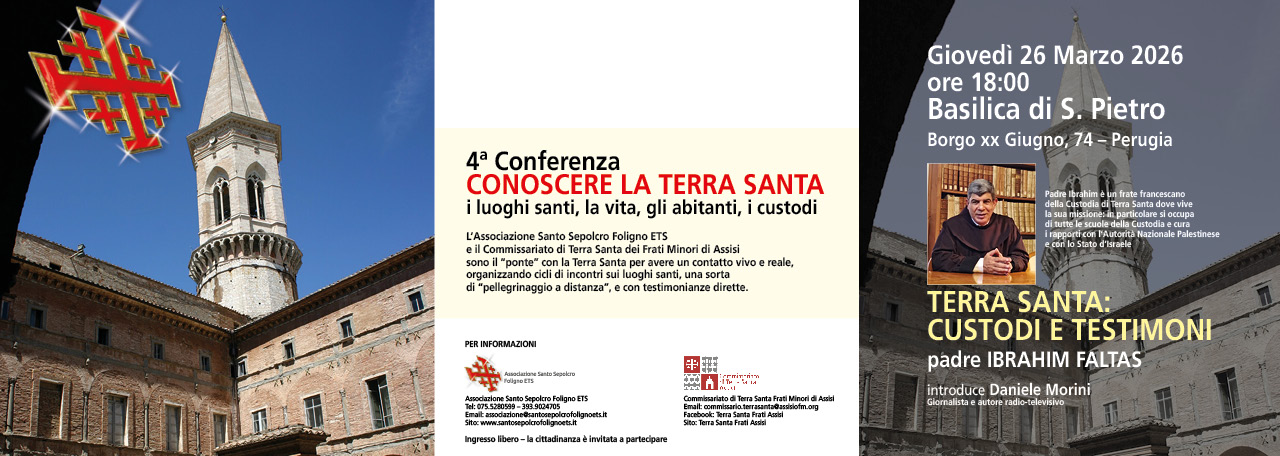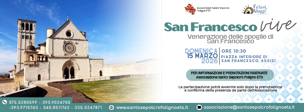 Il Comune di Foligno, a seguito dei tanti eventi culturali promossi, negli anni, in alcune città italiane e gestite dall’ Associazione, ha emesso il decreto N° 28 del 18 dicembre 2023, firmato dal Sindaco Avv. Stefano Zuccarini, nel quale l’ Associazione Santo Sepolcro Foligno ETS è stata inserita nell’ Albo delle Associazioni Culturali del Comune. Si ringrazia il Sindaco e tutta l’ Amministrazione comunale.